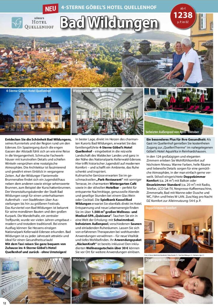 Bad Wildungen genießt weltweit einen hervorragenden Ruf. Die zahlreichen Heilquellen und das milde Reizklima bieten ideale Voraussetzungen für einen erholsamen Gesundheitsurlaub. Entspannen Sie sich beim Spaziergang durch Europas größten Kurpark (50 ha) oder beim Einkaufsbummel durch die malerische Altstadt mit ihren Fachwerkhäusern und ihrer prächtigen Bäderarchitektur. Mit dem Taxi geht es direkt von Ihrer Haustür ins 4-Sterne Göbel´s Hotel Quellenhof. Dort erwarten Sie stilvoll eingerichtete Zimmer und kulinarische Genüsse im Park-Restaurant. Lösen Sie Verspannungen mit Massagen und einer Wärmepackung. Den 1.500 qm großen Quisisana Spa mit Schwimmbad, Saunen und Whirlpool können Sie täglich nutzen. Das besondere Plus für Ihre Gesundheit: Als Gast im Quellenhof genießen Sie kostenfreien Zugang zur „QuellenTherme“ im nahegelegenen Göbel’s Hotel AquaVita in Reinhardshausen.