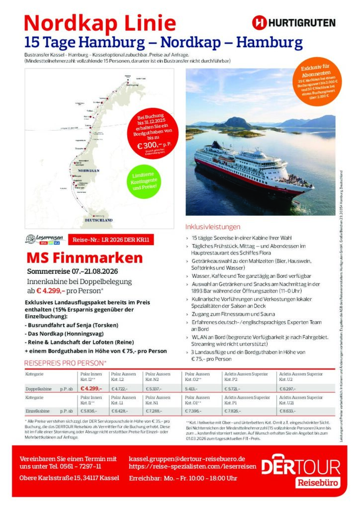 Erleben Sie eine unvergessliche 15-tägige Kreuzfahrt ab Hamburg bis zum majestätischen Nordkap und zurück an Bord der MS Finnmarken. Auf dieser Reise entlang der spektakulären norwegischen Küste erwarten Sie malerische Fjorde, charmante Hafenstädte und die endlose Weite des Nordmeers. Genießen Sie an Bord skandinavische Gastfreundschaft, kulinarische Köstlichkeiten und komfortable Kabinen mit Panoramablick. Ein Highlight: das Erreichen des Nordkaps, wo Sie am nördlichsten Punkt Europas das Gefühl grenzenloser Freiheit spüren.