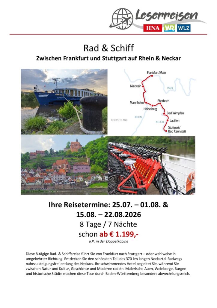 Erleben Sie eine genussvolle Auszeit auf Rhein und Neckar und entdecken Sie die Region aktiv und zugleich ganz entspannt. Auf abwechslungsreichen Radtouren führen Sie gut ausgebaute Wege durch idyllische Flusslandschaften, Weinberge, historische Städte und vorbei an beeindruckenden Burgen. Ihr komfortables Schiff begleitet Sie dabei als schwimmendes Hotel und erwartet Sie täglich am Etappenziel. Freuen Sie sich auf entspannte Stunden an Bord, kulinarischen Genuss und das besondere Gefühl, jeden Tag neue Landschaften zu erleben – ganz ohne Kofferpacken.